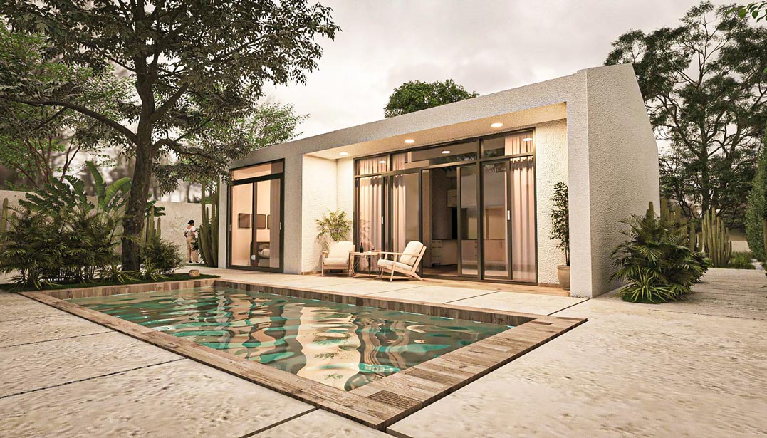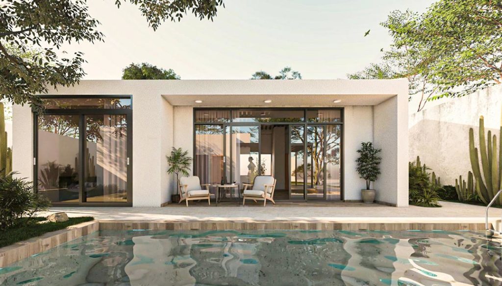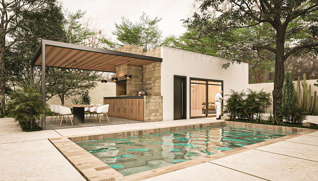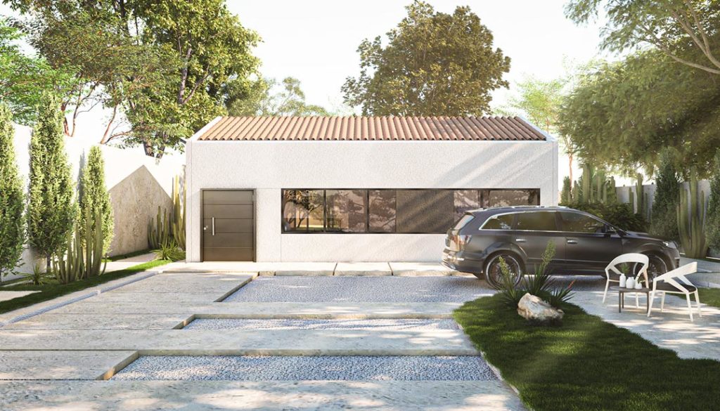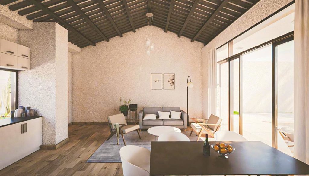 Casa Guadalupe es un proyecto singular, un práctico jardín de cactáceas es la antesala a dos volúmenes que se reparten en una parcela de 1.000 m², con la piscina como pieza articular. El primer volumen alberga la casa principal que se asemeja a un clásico estilo mediterráneo pero con matices de modernidad en sus líneas. El living de la vivienda principal se abre hacia la terraza y la piscina a continuación.
